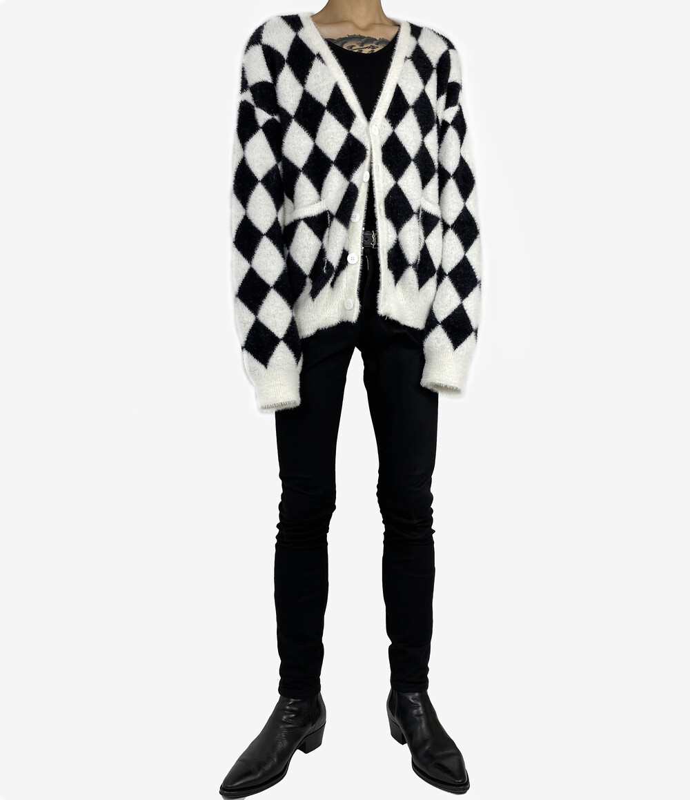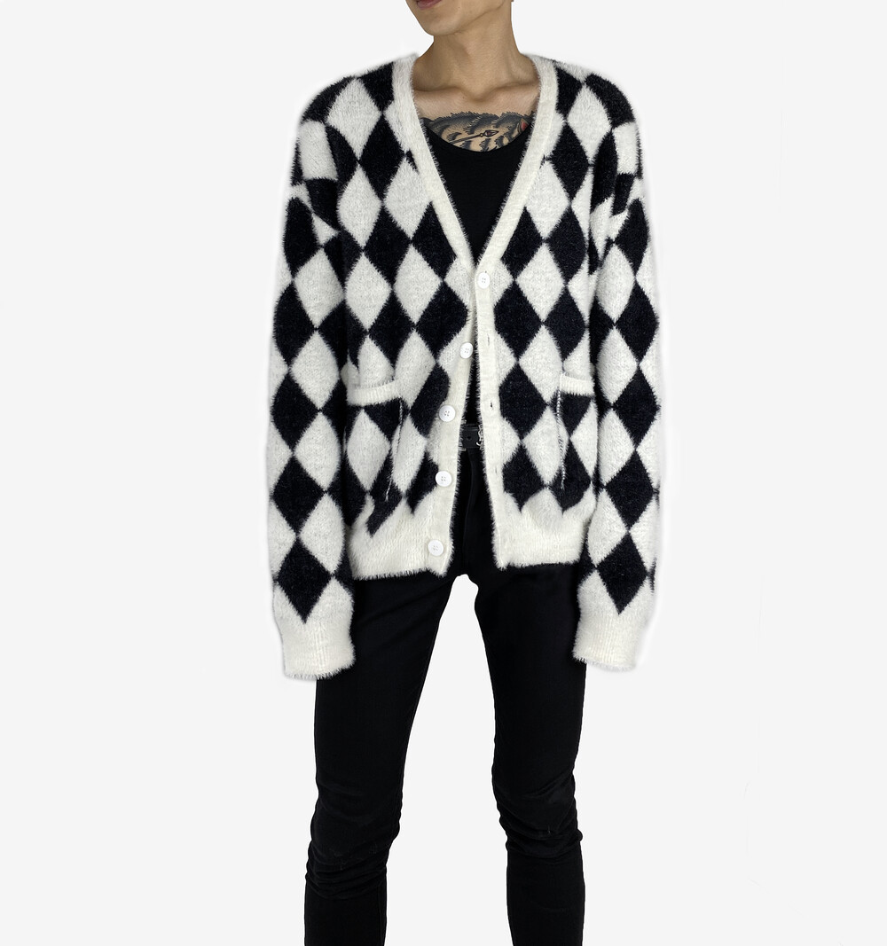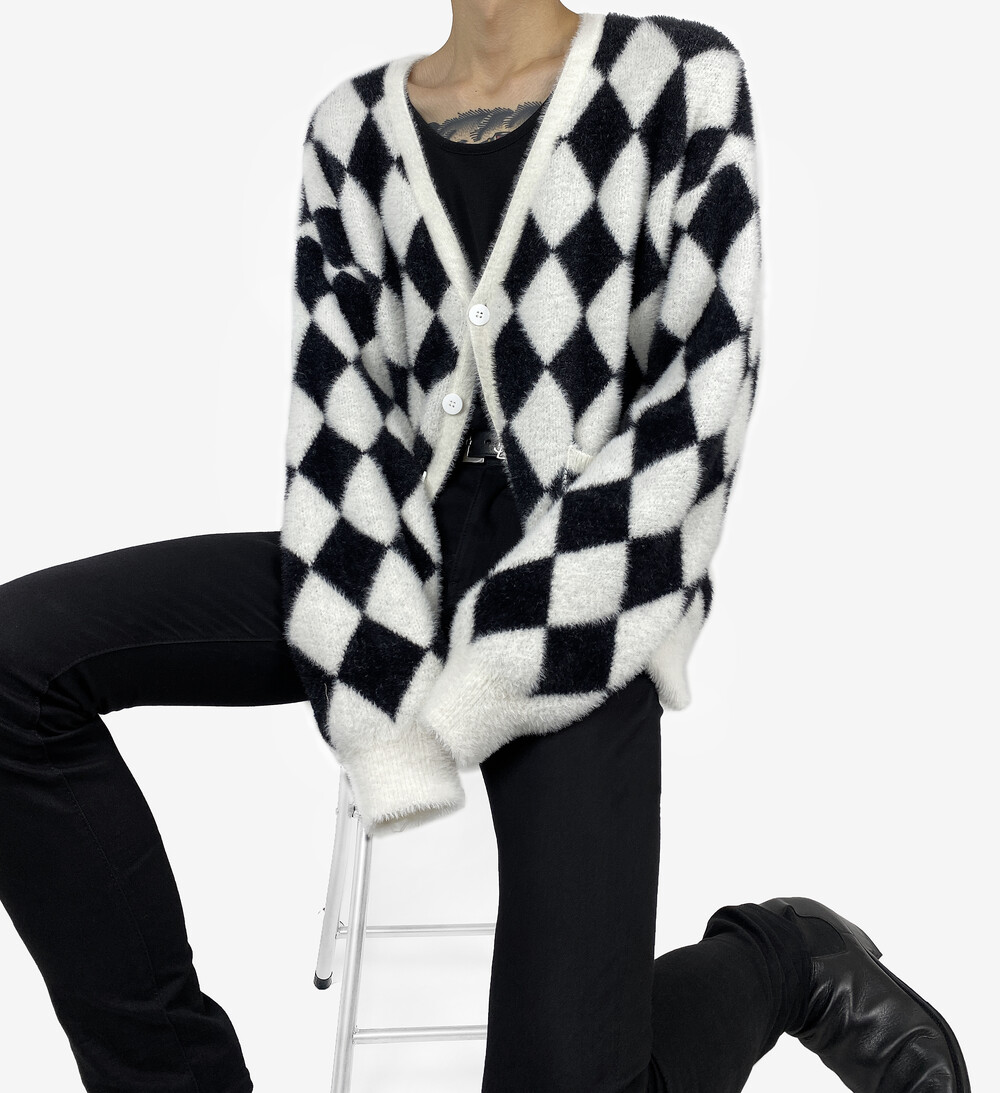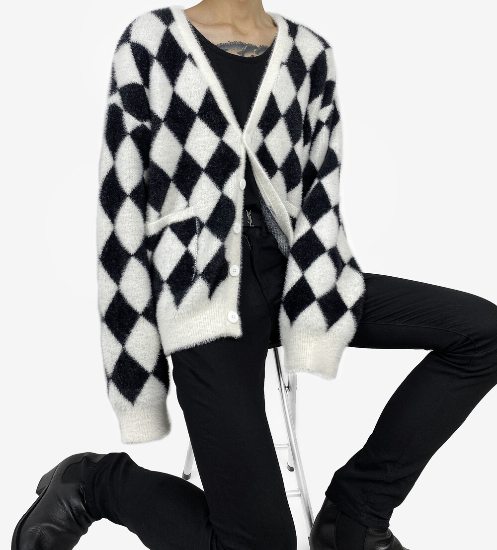Mohair check fur cardigan